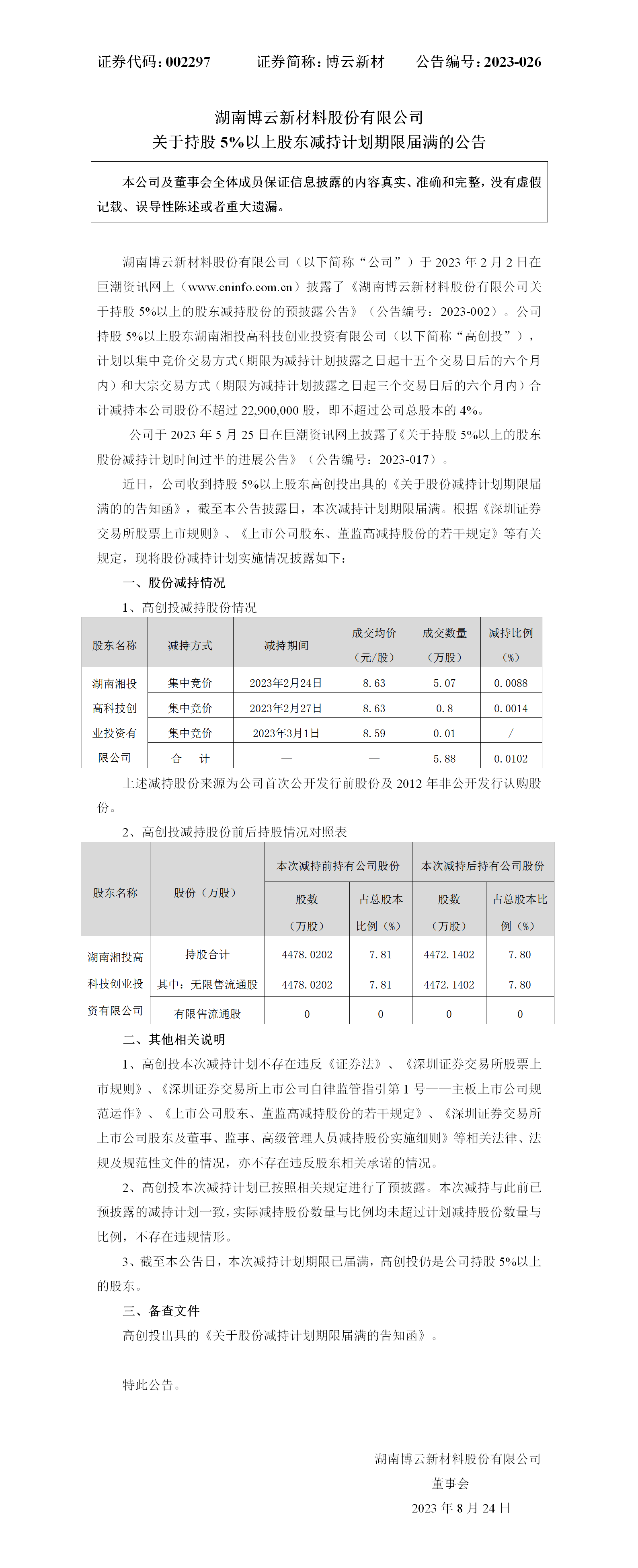 【2023-026】关于持股5%以上股东减持妄想限期届满的通告